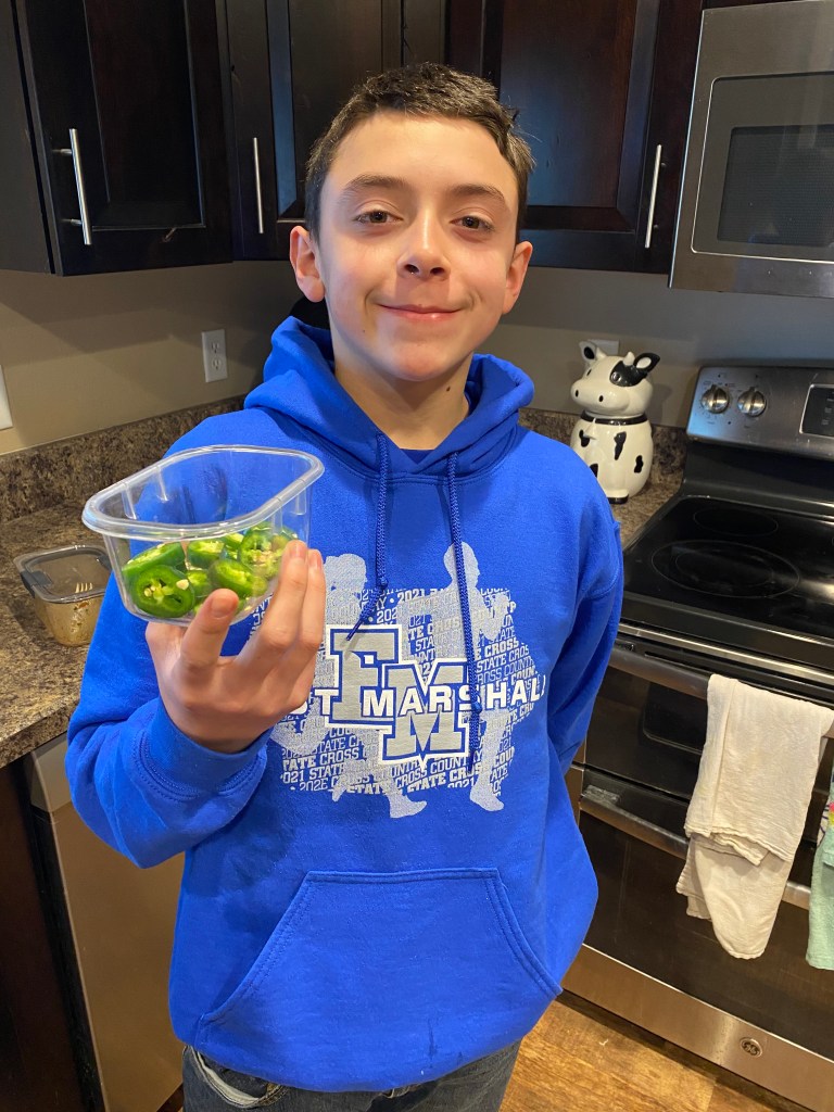 What would you do if your 13 year old challenged you to a jalapeno pepper contest? Would you pass or accept it? I accepted it! The two of us our pretty competitive so I knew it wasn’t going to be an easy challenge. We had slices of jalapenos left over from tacos and salsa the other night, so we had 11 1/2 slices per person. Coop learned after the 3rd round that the ones with the seeds in them were the hotter ones. Haha! We started with one pepper at a time and added one more to it each round. We set the timer for one minute after we swallowed the pepper and you couldn’t take a drink until the timer went off. He put up a good fight! The last round we had 5 1/2 peppers in our mouth and that’s the one that got me. It was down to only peppers that had seeds in them. I think Coop and I had our three cups of milk for the day after that round. I don’t drink milk, but I couldn’t get enough of it. Cooper waited until I took the first drink and claimed that he won because I took a drink first. Little turd, but I will give it to him…he had a lot of peppers with the seeds in it and they were packing heat.