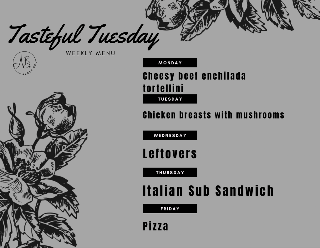 Here is another week, and yes I have had the chicken breast with mushrooms on my menu for the past three weeks. No we haven’t had it three times, it’s just the one recipe that has been at the end of the week and I didn’t make due to plans or we had so much leftover of the food before that I didn’t want to make more food when we needed to eat what was leftover. This week it is happening!