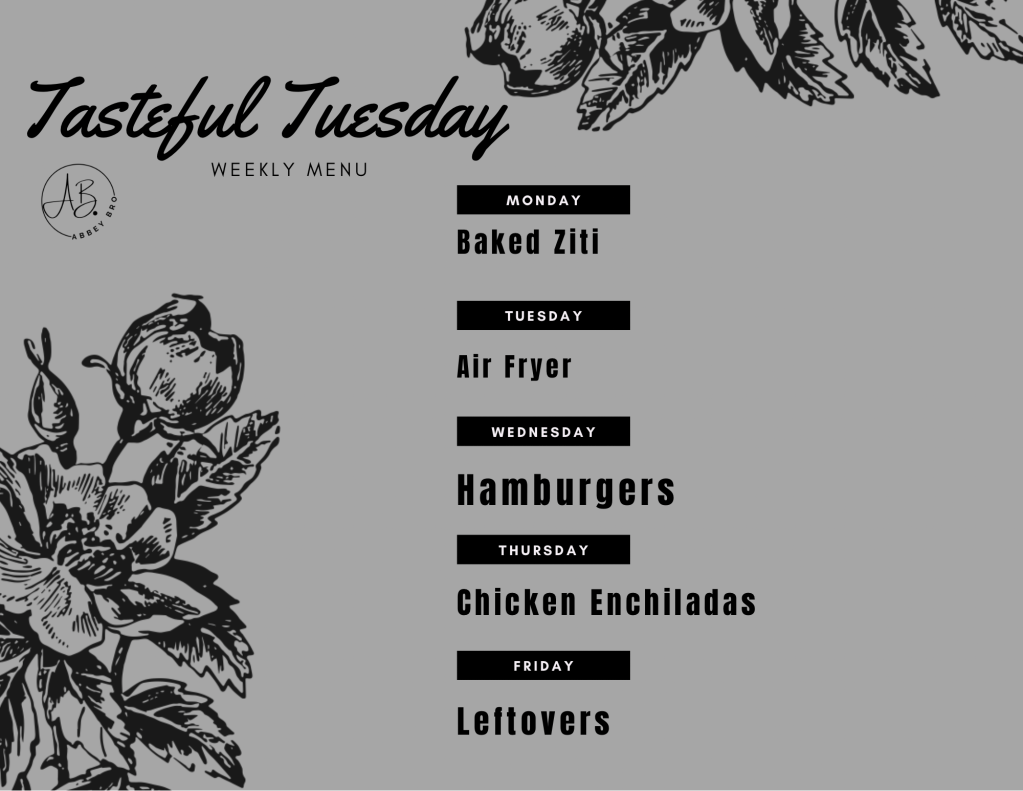 Happy Tuesday! This week’s menu is pretty low key. I need to put a note in my recipes for the baked ziti though. One dish makes a huge batch 🤣 I always double it and when I do that we never touch the second pan. I never remember until it’s too late. Here’s the menu: