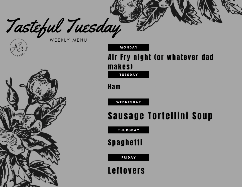 Tasteful Tuesday is here! This is kind of a crazy week, so things might not be made in this order…but they will be made this week! as always check out the full recipes on over at my recipe page here https://heyitsabbey.com/recipes/