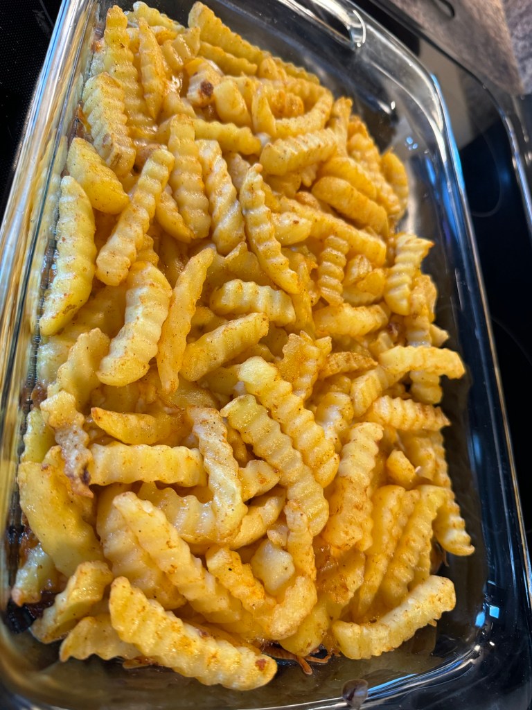 - Drain fat using a colander and place meat into a 9×13 baking dish.