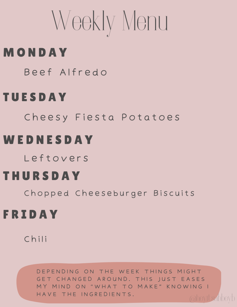 It has been a long time since I have posted a weekly menu. To be honest, I have been slacking in that department. Whoops! After harvest I just got burnt out, and needed a break. From going 3-5ish days making a full meal with sides, and dessert I was mentally and physically done for awhile. Here is our menu for the week! I am excited to try these, they are all new to us meals and I can’t wait to share them with you!